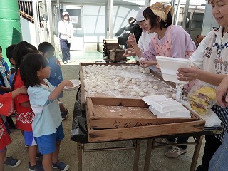 おすもうさんとおもちつきをしました!講堂では先生がおもちの作り方やおもちつきの意味を教えてくれました。きねとうすで「ぺったんこ、よいしょ!」大きな声でおもちをつきます。美味しくなるように心をこめて丸めました。美味しいお持ちをペロリと食べていました。