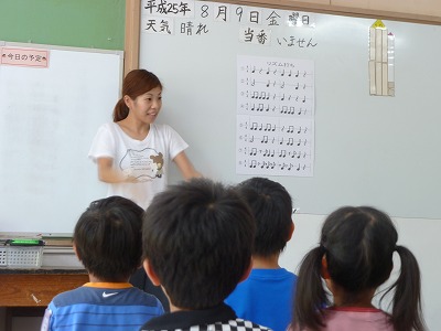 日頃からの日課である名前よびをしています。しっかり伸びた手、先生を見つめる真剣な顔は夏休みでも変わりません。暑い中でもみんなしっかり集中できていました!!!さすがですね。