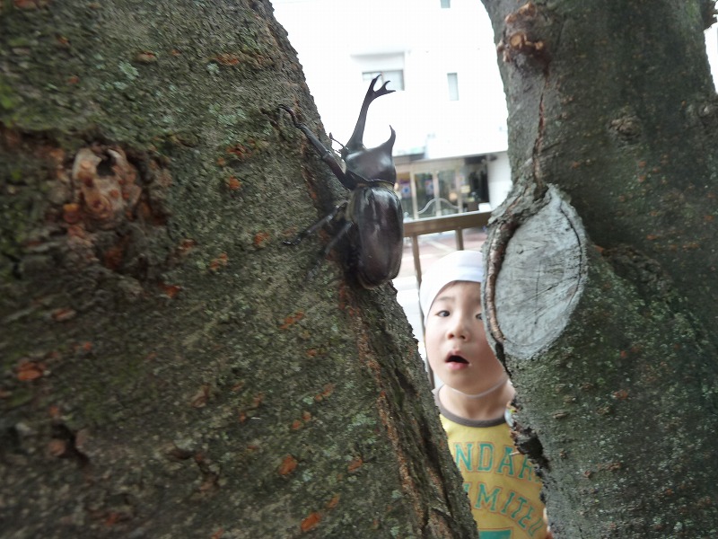 そんなとき・・・なんと園庭の木に立派なカブトムシが!