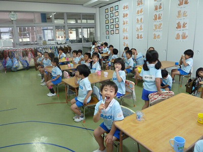 昼食後には歯磨きの指導を行います。鉛筆のように歯ブラシを持ち、 音楽に合わせながら、楽しく磨きます。『シャカシャカ』という音を聞かせてね というと、しっかり磨くようになりますよ!!
