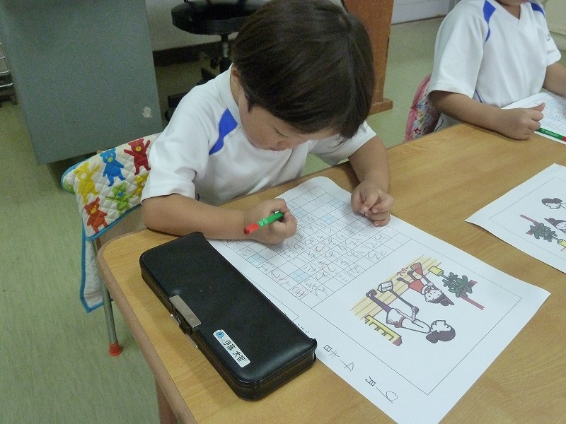 今日はみんなでプリント活動をしました。えんぴつも上手に削れるようになり、姿勢もピンと伸びています。文字もはみださないようになぞれるようになり、花丸いっぱいのプリントを見て、ニッコリ笑顔のこどもたちでした☆