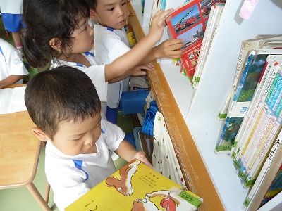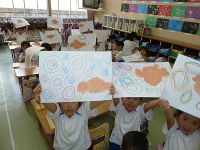 タイルを使って階段をつくります「これは1」「これは・・・」頭をいっぱい使って遊びました。「タイルの1サカナの1同じ1だね。」たくさんの発見がある数遊びは楽しいね。