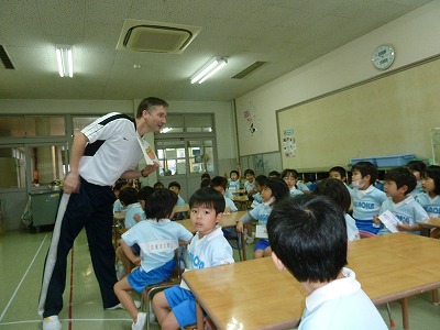 アーネスト先生との楽しい英語の時間! 今日は「Do you like~?(~は好きですか?」を教えてもらいました。 先生が見せるハンバーガーやジュースをみて、「Yes,I do」「No,I don´t」と上手に答えられるようになりましたよ(^▽^)