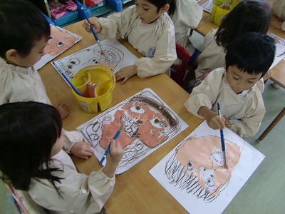 年少は、初めて自分の顔に挑戦しましたよ。鼻の穴から順番に1つ1つ丁寧に描きあげました。「色を塗って、生きているみたいにしようね」と話すととてもうれしそうにしていましたよ。あと一歩で完成です☆