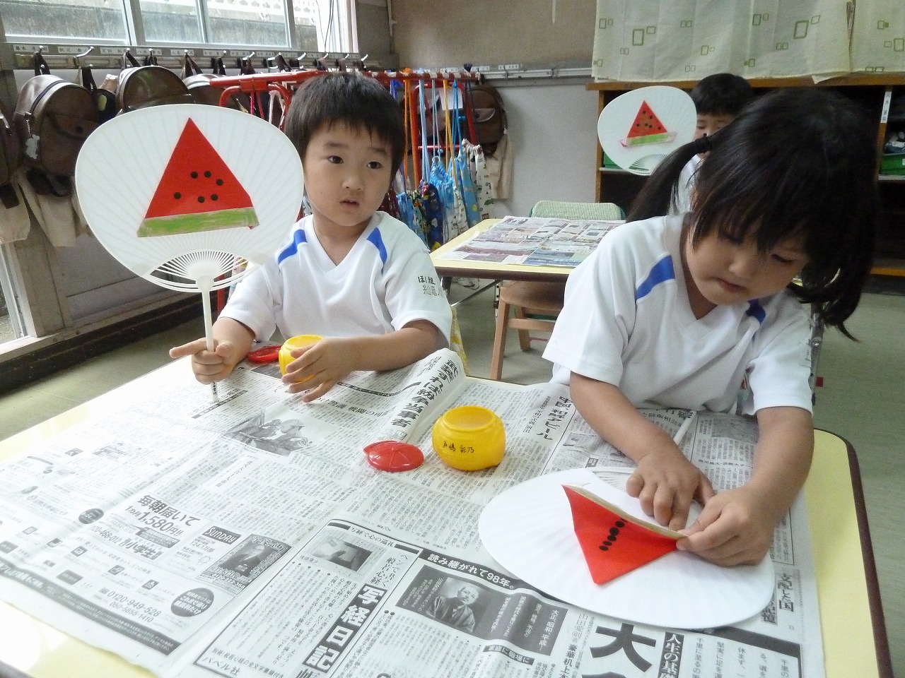 7月7日の七夕まつりで使ううちわ作り!!折り紙で作ったスイカを貼って夏気分☆パタパタパタ~涼しいな!!