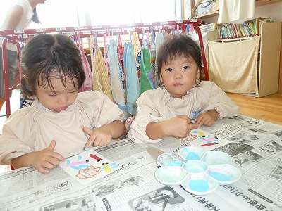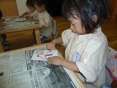 今日は、最年少組で敬老の日に向けて、ハガキ作りをしました。 指絵の具でトンボの羽を作って完成です!! 「じぃじとばぁばにプレゼントする!!」と張り切って作ってくれましたよ☆ 投函するのが今から楽しみですね♪