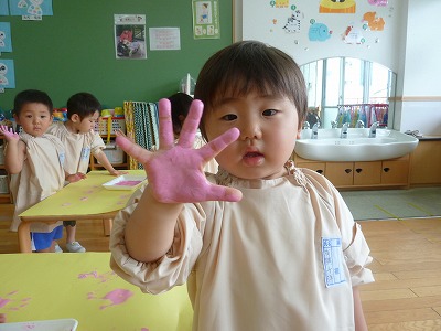 今日は、最年少クラスで大きな模造紙に手形スタンプ遊びをしました。 初めて使う絵の具にみんな興味津々です。 「ペッタン!!」「うわぁ!!」などの歓声もあがっていましたよ。 とっても楽しかったようです☆