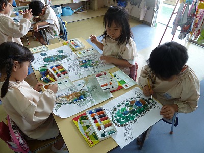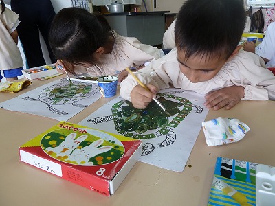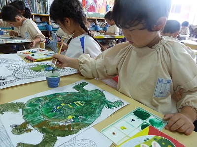 今年長組では、カメの絵を描いています!! 先日行った動物園の遠足で見たカメを思い出しながら、細かい模様や手足の動きをうまく表現していますよ(^^) 色塗りにも一人ひとり個性があってとても面白いですよ!顔をグッと近づけて塗る表情はまさに真剣そのもの!! 出来上がりが楽しみです☆