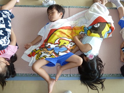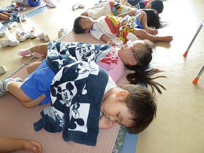 この暑さにも子どもたちは負けず、元気いっぱい!! 元気に遊んだ後は、おいしいお弁当を食べ、みんなで「おやすみなさい。。。」 ぐっすり気持ちよさそうに眠っている様子を見ていると、だんだん眠たくなりますね(^^) よく遊び、よく食べ、よく眠る! 元気な証拠ですね☆