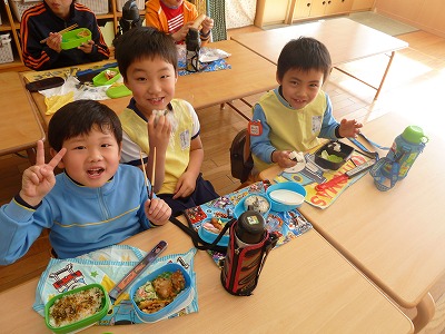 今日は太陽も顔をだし、いつもよりぽかぽかの暖かい陽気でした。お外で遊んだ後は、大好きなお弁当の時間!いつもとは違うクラスのお友達や、先生達とたのしく食べました。アンパンマンのおにぎりやサンドイッチ。手作りのお弁当に子ども達もニコニコ笑顔です。