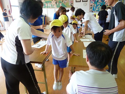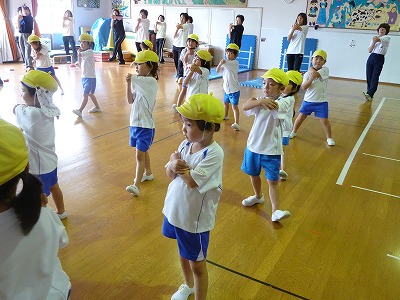 お手玉を遠くに投げたり、ジャンプしたり、体を前に倒したり