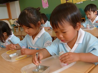 最年少の子ども達は、手先が少しずつ器用になってきています☆ 今日はトングで豆つまみをして、クロレラの容器に入れ、みんなで楽器をつくりましたよ♪ 真剣に取り組んでいる姿は、とってもかっこいいですね。 「音が聞こえた~」「おもちゃのチャチャチャ❤」みんな大喜びでした!!