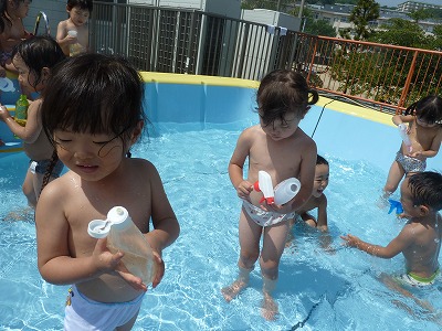 最年少初めての水遊びの日です!!みんな朝から「今日は出来るかな?」と楽しみにしていました☆お弁当を食べて、みんなで大きなプールに入りました♪とっても楽しかったです!! 水をかけあったり、顔を洗ったり……。いろんな子どもたちの様子が見れました。 また来週あるので、楽しみにしていてほしいです。
