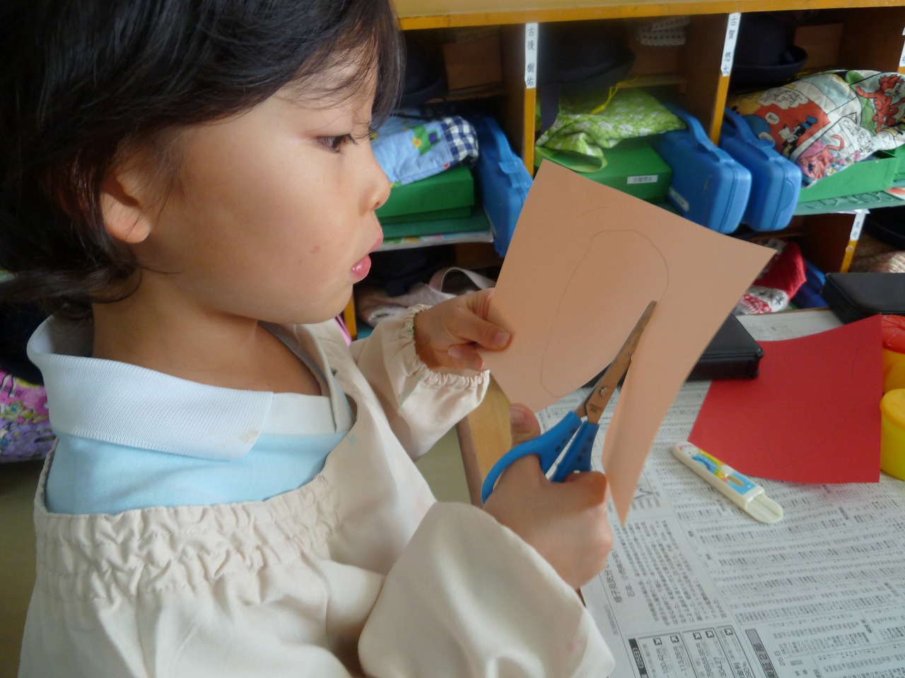 とても真剣な顔つきで、色画用紙をチョキチョキ。