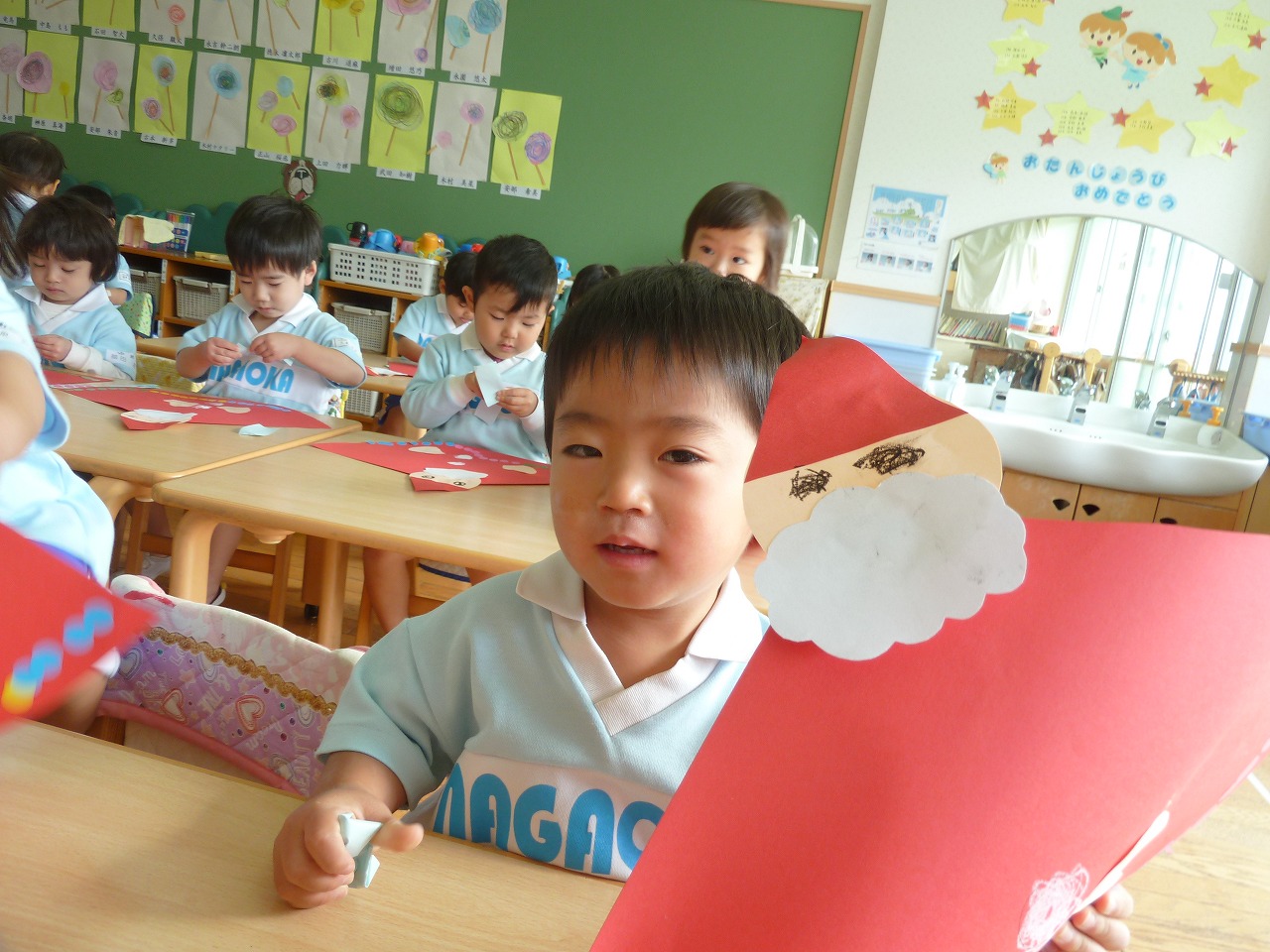 真っ赤な三角帽子に、真っ白なおひげ。顔に上手に貼れました。