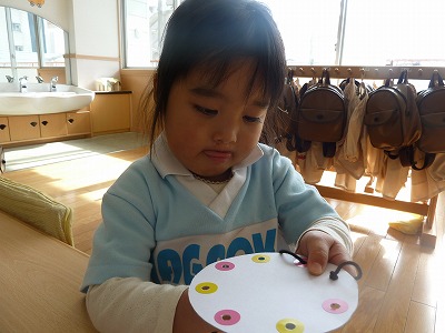 最年少さんも少しずつ手先が器用になってきましたよ。ひも通しの活動では、一生懸命ひもを穴に通す姿も見られ頑張っていました。「やったー出来た!!」と大満足な子どもたちでした。