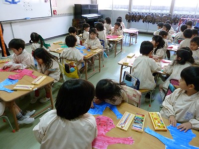 「鬼は~外!福は~内!!」今、年少組では、2月3日の節分の日に向けて鬼のお面を作っています。