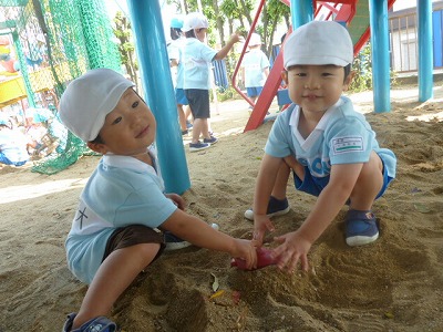 だんだん肌寒くなってきましたが、最年少組は寒さもへっちゃら!!お友達と砂場でお山を作ったり、落ち葉を拾ったり☆最近では、お兄さんお姉さんと一緒に遊ぶ姿も…!!子ども達も大喜びです。