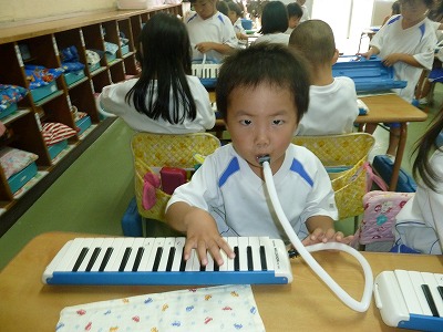 子どもたちが大好きな活動の1つでもあるメロディオン!年少組は1つの音を1つずつおさえていっています。今日は『ドレミ』の3つの音に初挑戦!!「ドレミ、ドレミ」と歌いながら、よくできました(^▽^)