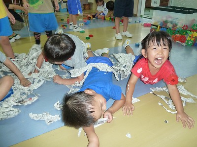 今日もあいにくの雨・・・。外で遊べない子ども達はとっても悲しそうでした。そこで特別に!!!今日は講堂で体育用具などをいっぱい使って遊びました♪