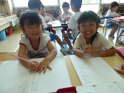 えんぴつを持って何書こうかな~?「バナナ~!!」「まるかけたよ。」と楽しんで書いていました。  年長さんは、文字を書いたり、絵に色をぬったりと一生懸命取り組む姿はかっこよかったです。