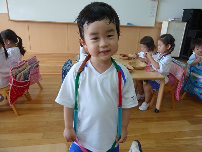 「いただきます。」待ちに待ったお昼の時間。今日は、給食の先生が作ってくれたおいしい給食です☆最年少さんは、自分で準備もするんですよ。「おいしいね。」「全部食べたよ。」とニコニコ笑顔。食べ終わったら自分で片付けて「ごちそうさま。」あーおいしかった♪