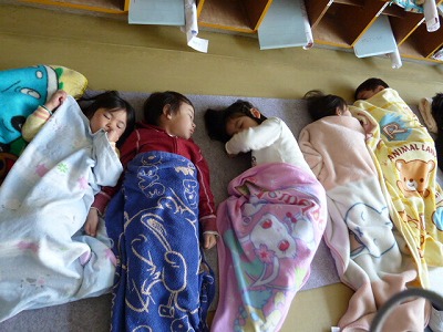 お腹いっぱいご飯を食べた後は…午後の外遊びに備え、しっかり体を休めていました。