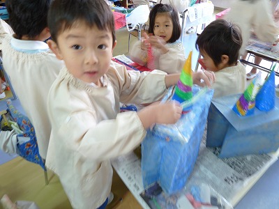 お面に目とまゆ毛を貼って…「こわそうだね!!」と聞くと「こわくないよ~!!」と答える子どもたち♪一人ひとりいろんな表情のオニができました。完成はあと少し・・・どんなオニができるか、とても楽しみです。