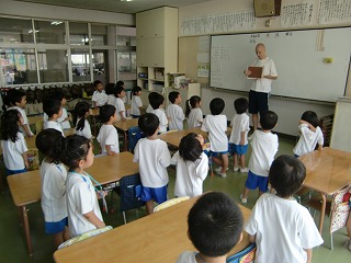 子ども達は英語レッスンが大好き☆ニック先生が教室にくるとみんな大喜びです!一緒に歌を歌ったり、ゲームをしているときの子ども達はほんとにいい笑顔。「〇ちゃん、good!」と誉められると嬉しそうにしていますよ。毎週の英語レッスンだけでなく、その他のローテーションでも一緒なので「また後で会えるね~」と話していましたよ。