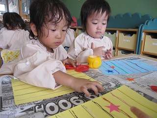 何色にしようかな?どこに貼ろうかな?など自分達で考えたり、先生と同じにしたりと一人ひとり違った柄の国旗が出来ました!!