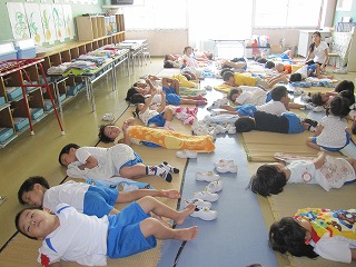今日も暑い1日でしたね。たくさん遊んで、お弁当をお腹いっぱい食べた子ども達は、お昼寝に向かいます。疲れてすぐ眠る子もいれば、お友達のことが気になってなかなか眠れない子もいます♪しっかり休んでまた元気に遊ぼうね!!