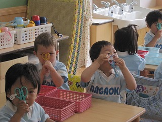 今日は、はさみを使って製作をしました。合言葉は“グーパー・グーパー”