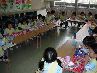 大好きなお弁当、今日は机を円にして、みんなで仲良く食べました。