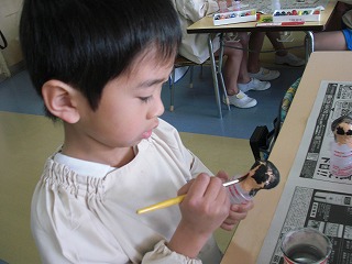 3月3日はひなまつり☆年長組ではヤクルト容器と紙粘土を使ってひな人形を作っています。今日は色塗りです。子どもたちは真剣に取り組んでいました。