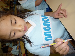 「鉛筆を軽くにぎって・・・」みんな一生懸命です。持ちやすいように赤い印をつけて、子どもたちは鉛筆の持ち方が上手になってきています。後は、”もっとゆっくり、もっと丁寧に”が目標です☆