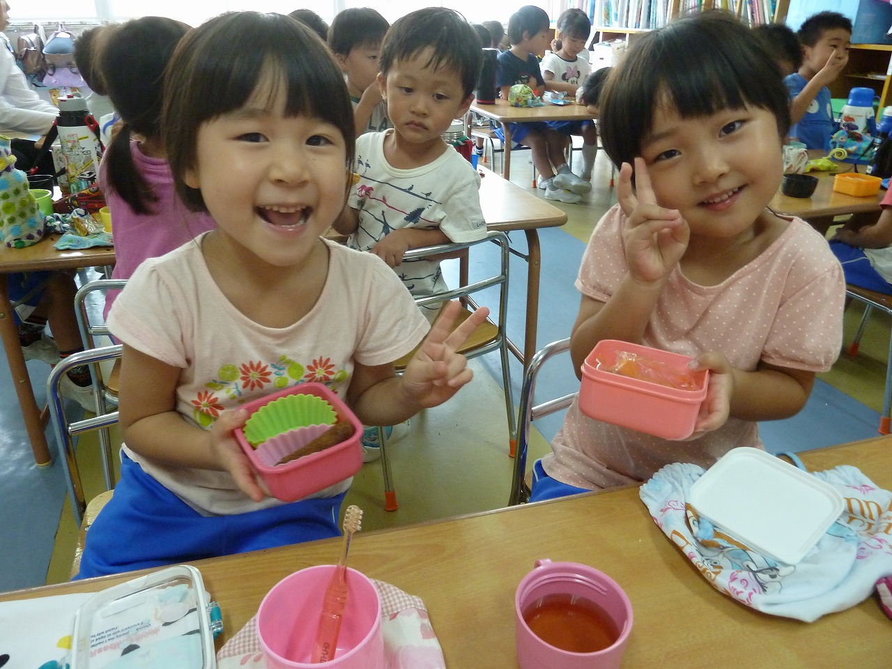 沢山遊んで、美味しいお弁当も食べて、みんなで仲良くおやつも食べます!いろんなクラスのお友達と、お話しもしながら食べる、おやつはとても美味しかったね♪