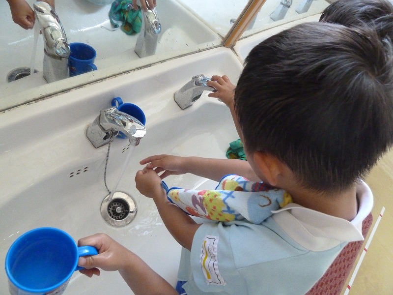 外から帰ったらもちろん!!手洗いうがいです。♪おねがい~おねがい~と、手洗いの歌をうたいながらどの子も上手に手洗いができるようになっています。うがいもしっかりして、強い体になっています!ばい菌バイバイ~