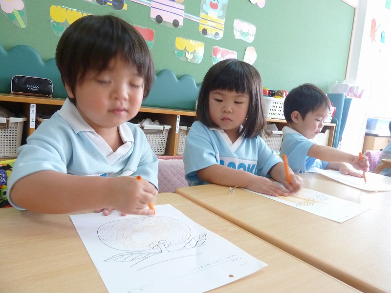 ぐるぐるぐる…画用紙いっぱいに大きな雲を描きました!ふわふわの雲、大きな雲、小さな雲…太陽があるよ、小鳥もとんでるよ♪と、子供達の想像も膨らみます。クレヨンを上手に動かして一人ひとり違った雲が完成しました。今度は飛行機を飛ばせてみようね!