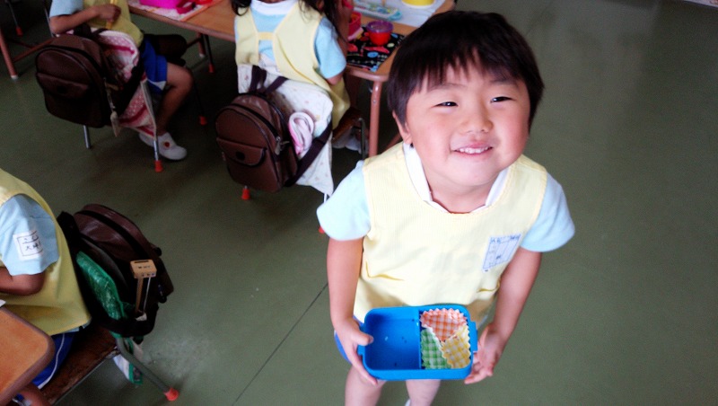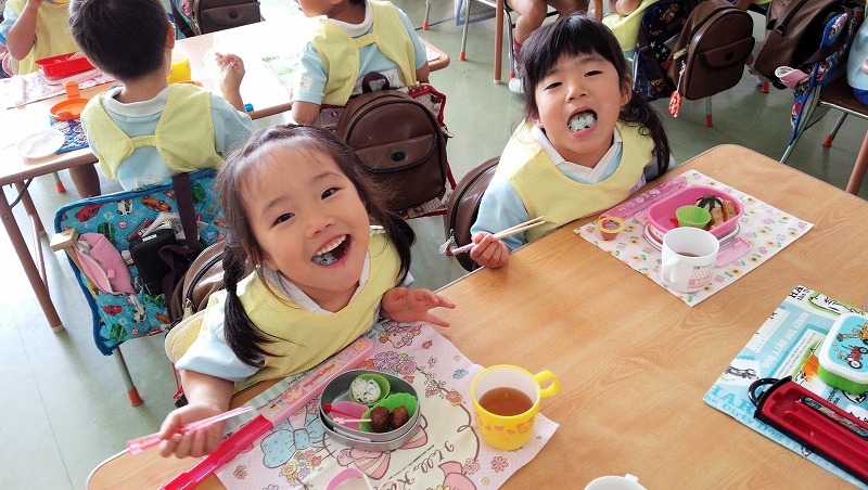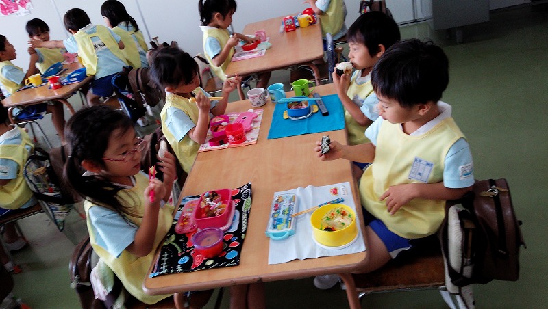 たくさん体を動かした後は、まちにまったお弁当の時間です。「今日はミートボールがはいってるよ。」と、お友達とお弁当の中身を見せ合う子ども達。みんなでたべるお弁当はとってもおいしいね!