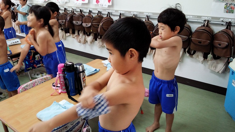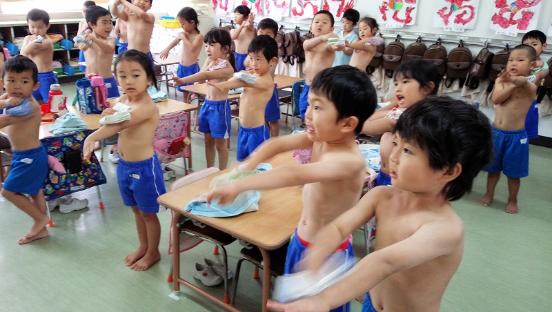 風も冷たくなり、寒い日が続いていますが、子ども達は元気いっぱいです!風邪を引かない元気な体を作るため、みんなで乾布摩擦に取り組んでいます。大きな声で1・2・3。元気な体でたくさん遊ぼうね☆