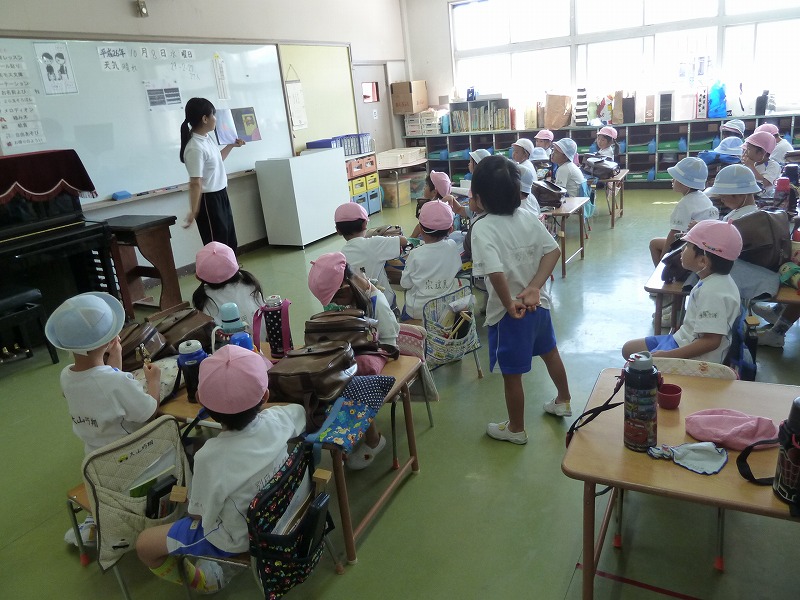 お外で元気に遊んだ後は、おかえりのご用意です!靴下を履いて、荷物の準備。2学期に入り準備もとっても上手になっています☆絵本読みが始まるとみんな真剣な顔。今日はどんなお話かな?