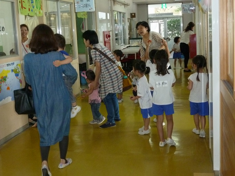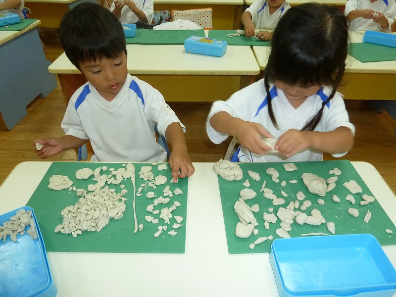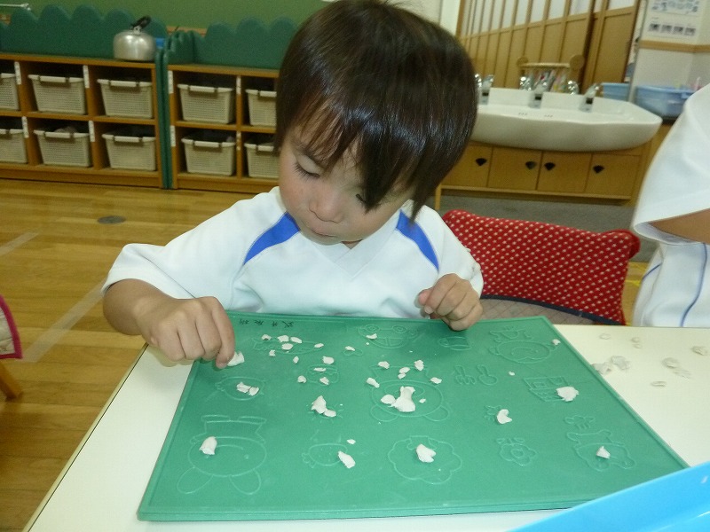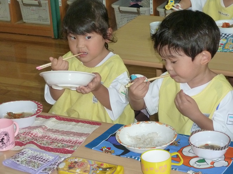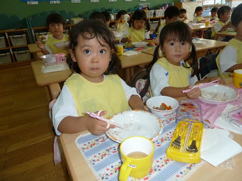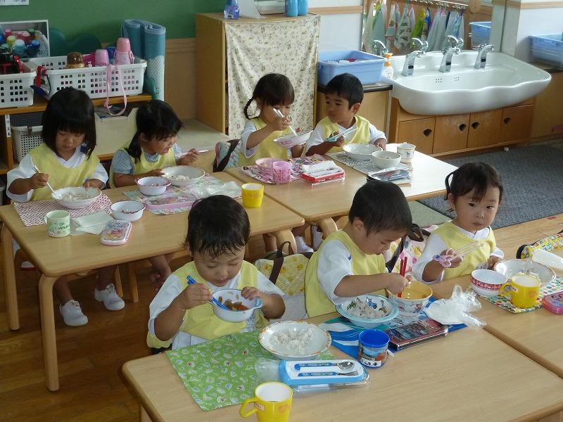 だーいすきなお弁当の時間!子どもたちはお母さんが作った愛情たっぷりのお弁当が大好き。「先生、たまごやき入っとったー!」「おいしいねー!」と会話が飛び交います。お箸を使うのも上手になってきましたよ!沢山食べて大きくなって下さいね♪