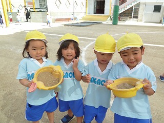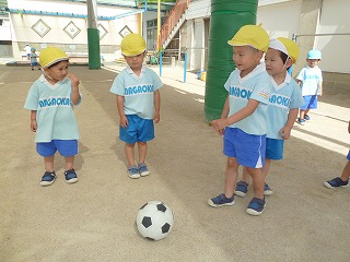 自由遊びの時間はそれぞれ好きな事をして遊んでいます。「○○くんこっちおいで~一緒にサッカーしよう!」「砂のケーキはいどうぞ」などお友達を誘う姿も見られ、嬉しい気持ちになります。長丘の子ども達は元気いっぱいです!
