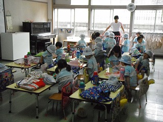 先生と一緒にお皿を準備して「いただきます!」