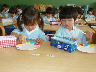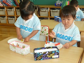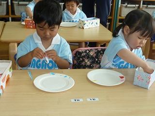 もうすぐ母の日ですね。最年少組は、お母さんへのプレゼントを作りました。