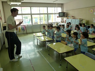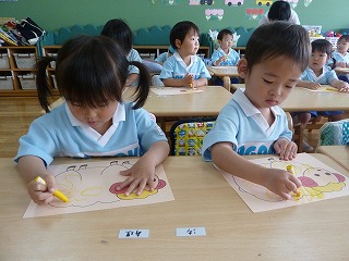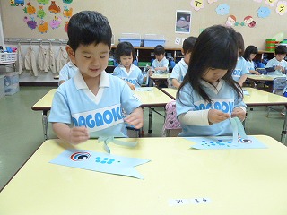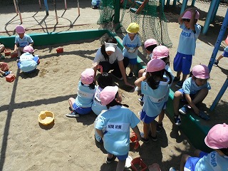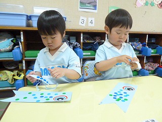 新聞紙をびりびり。小さく、たくさんちぎって新聞紙のシャワーにしたり、子ども達も大喜びです。次は、ボールを作ったり、おにぎりを作ったりして遊びたいと思います。