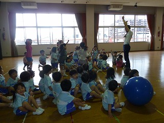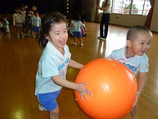今日は最年少組のお楽しみ会でした!広い講堂でみんなでリトミックをしたり、大きなバランスボールでボール運び競争をしたり…。