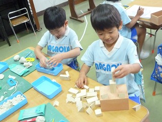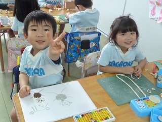 毎日朝の会をします。みんなで歌ったり体操したり、ここでもやはりかっこいい年長さんがお手本です。お話の聞き方、歌う時の大きな口、上手な体操。今日の朝の会チャンピオンは年長組のかなりあ組でした。