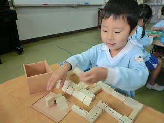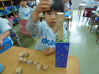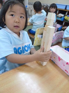 たくさんの四角の積み木を積み重ねて遊んでいます♪