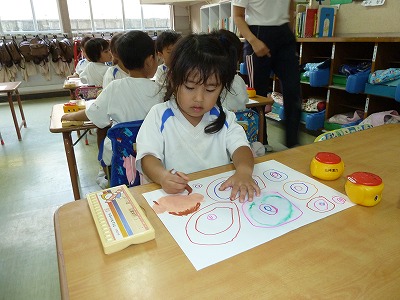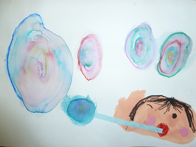みんなでシャボン玉あそびをした時の絵を描きました。大きくて丸いシャボン玉、小さくてきれいなシャボン玉。上手に描けてみんな「見てみて!」と大満足。完成したら、お教室にかざろうね♪